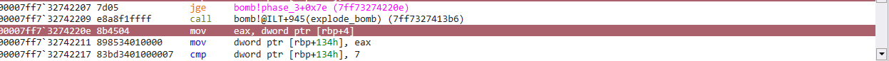, there is a value loaded from [rbp+4] being compared with 7. This is our first input being compared with 7, and if it is ‘above’, we will take a jump to a call to explode_bomb()