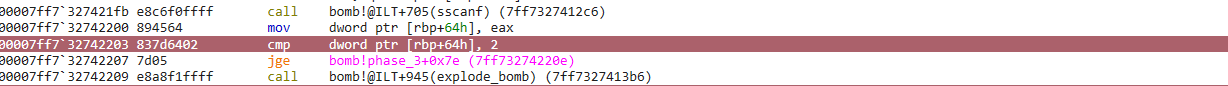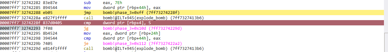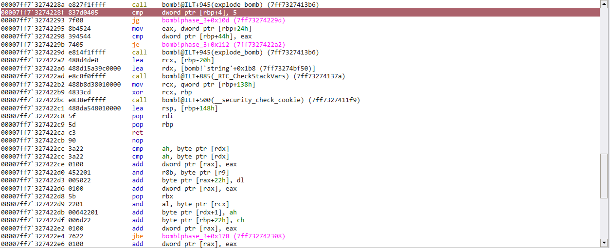 Continuing through the code, we see yet another comparison between [rbp+4], 5. This time we will take a jump to another call to explode_bomb()