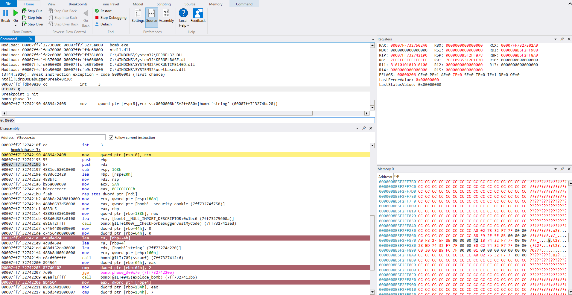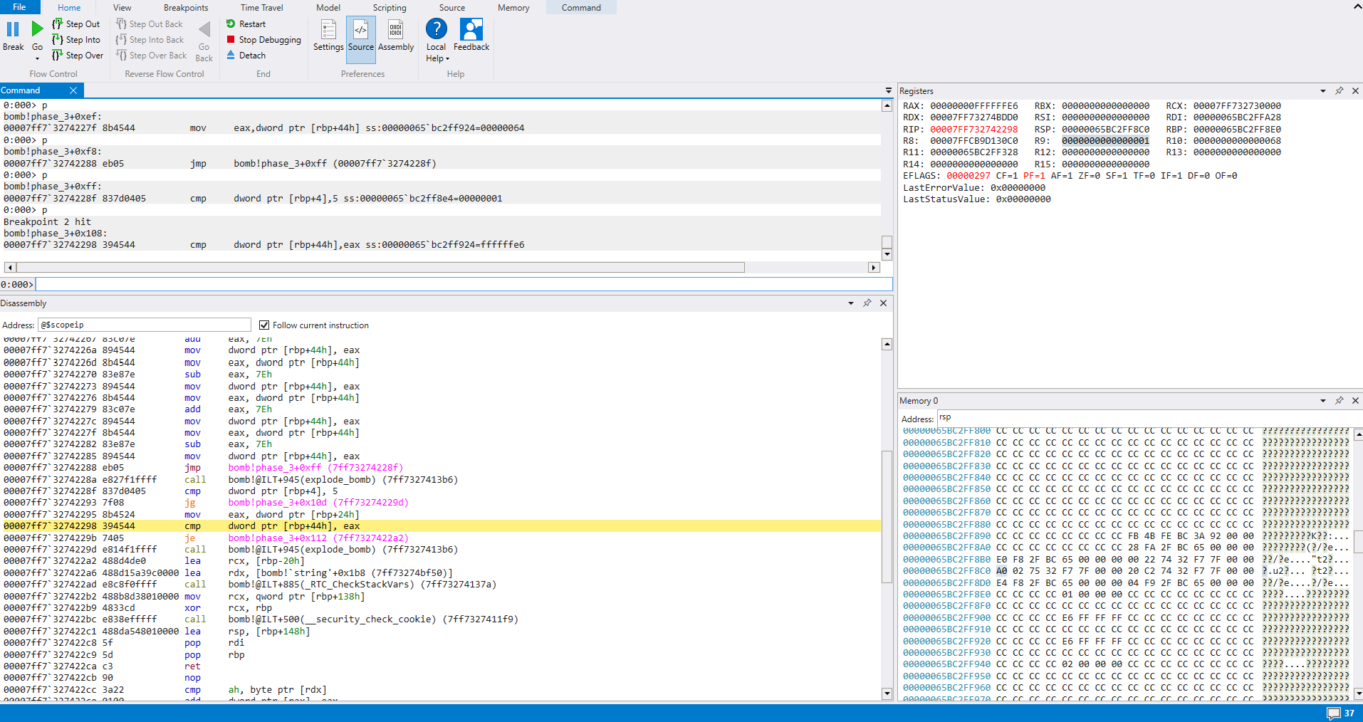 Viewing the registers window in the top right, we can see EAX successfully has the value the phase is expecting.