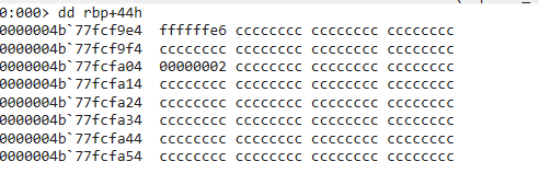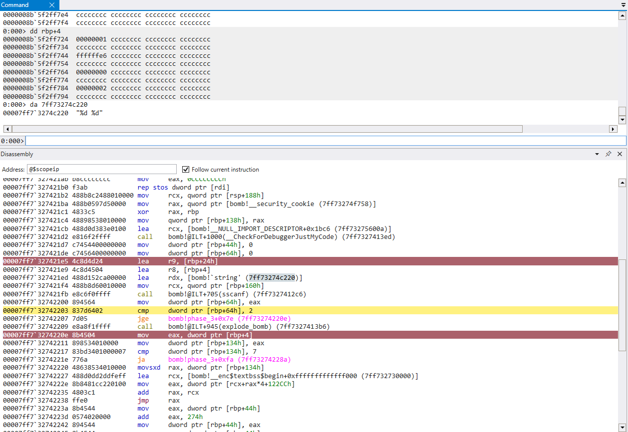 Printing the memory at [rbp+24h], we can observe our second input stored in memory. Printing [rbp+44h], we can see the expected number