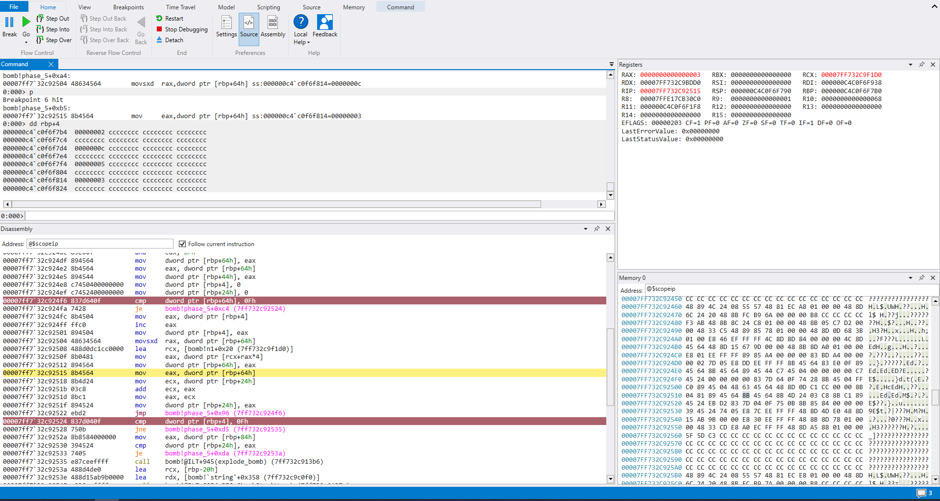 Looking at the register view window, we see RAX == 3, and printing the memory storing the counter