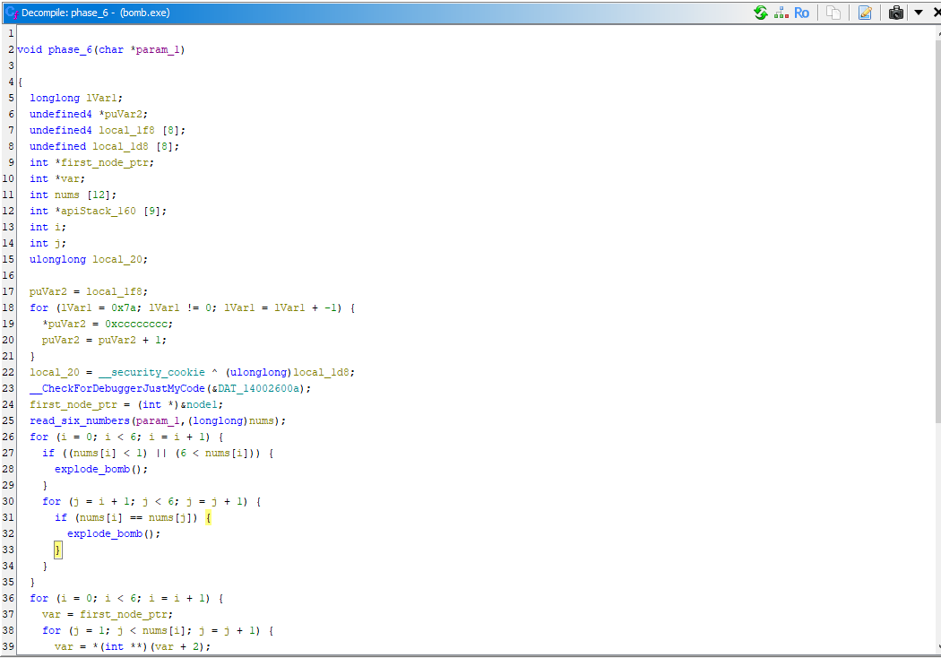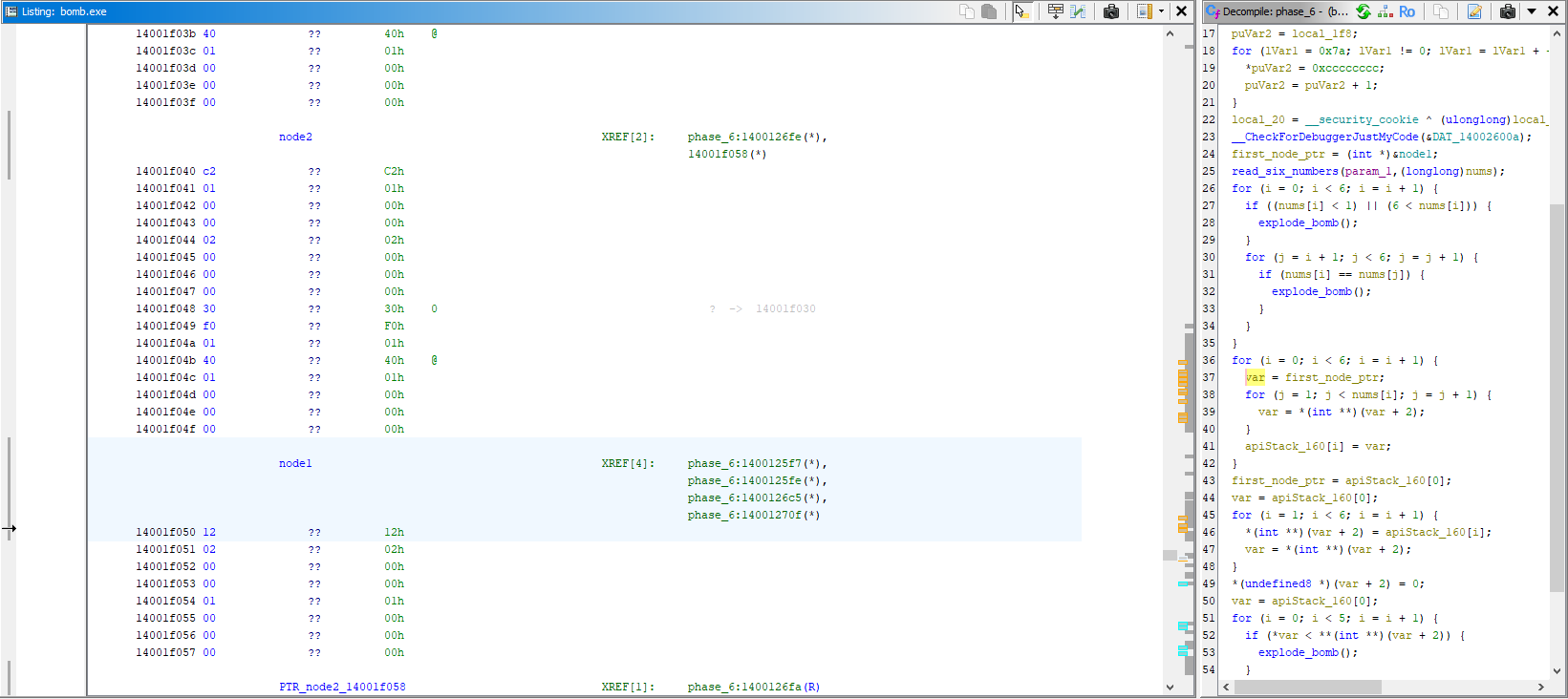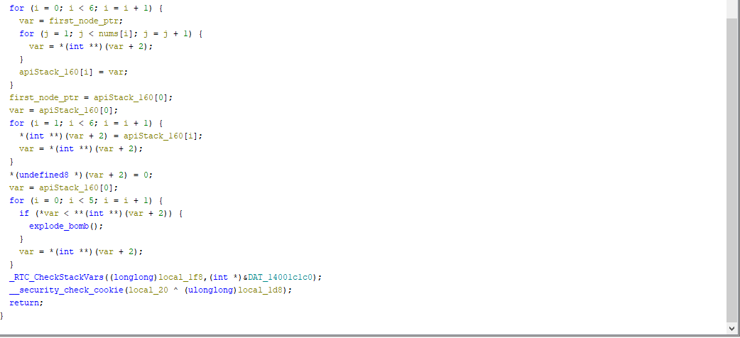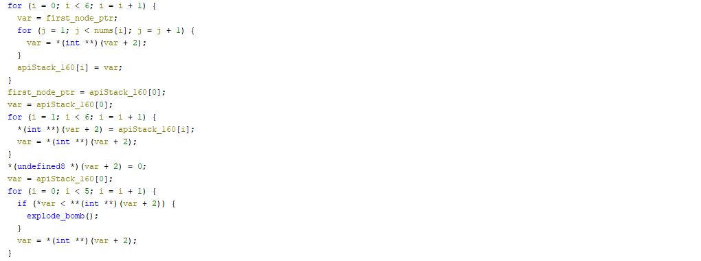 Which appears to be iterating from 0-5, comparing the dereferenced value of node n > n+1, and calling explode_bomb()