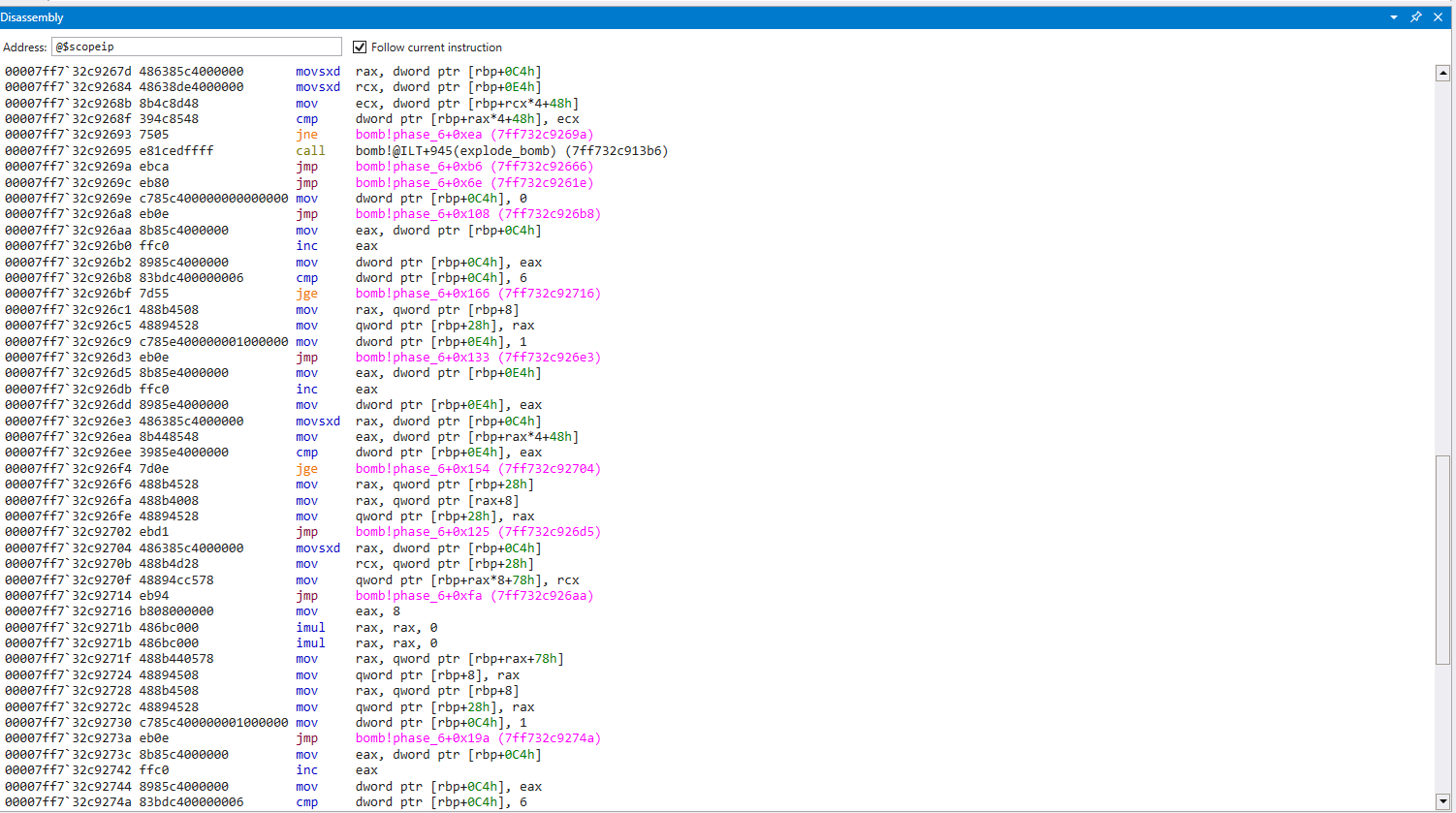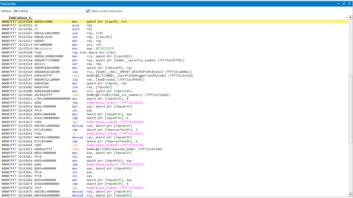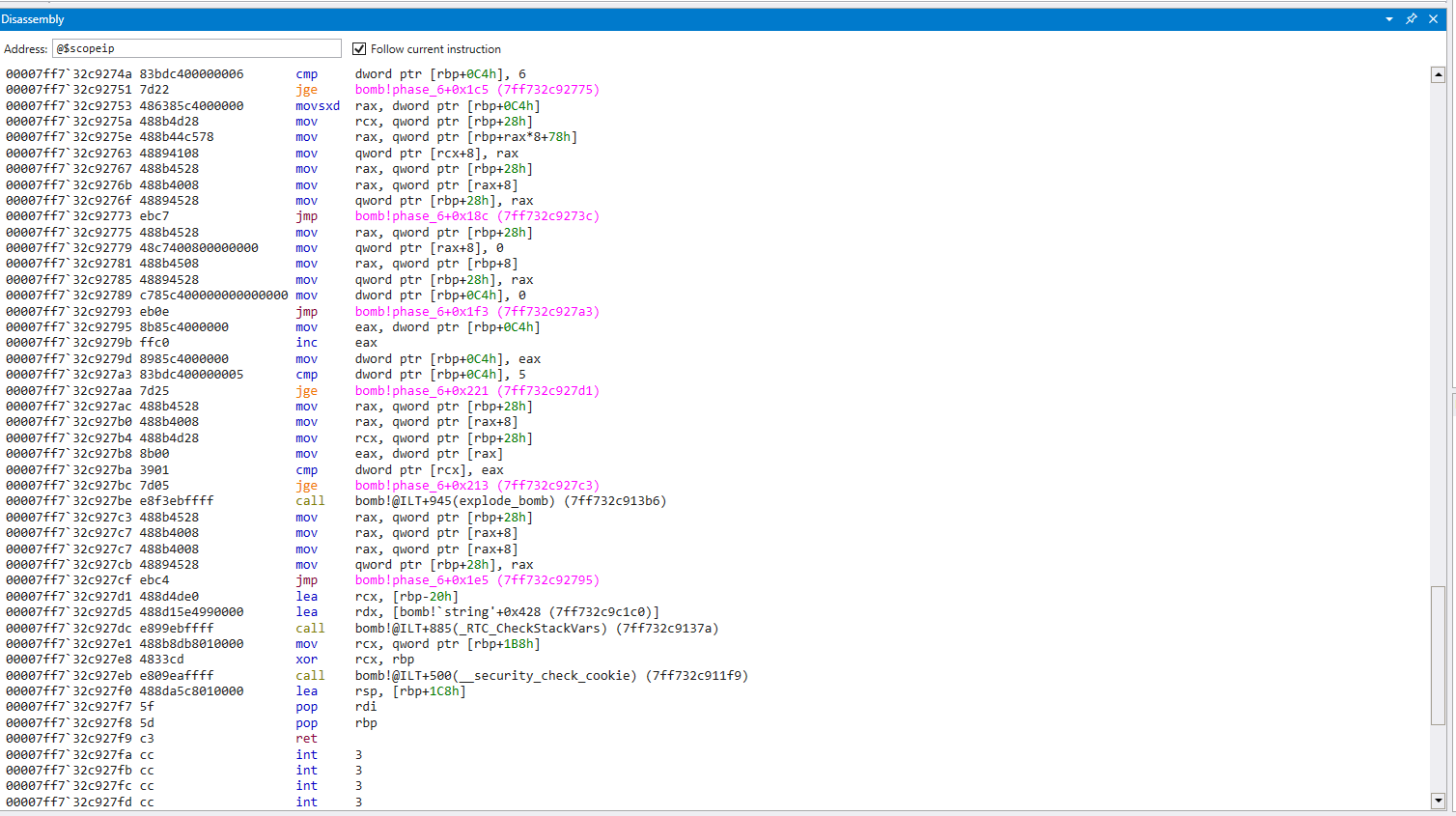 Which appears to be iterating from 0-5, comparing the dereferenced value of node n > n+1, and calling explode_bomb()