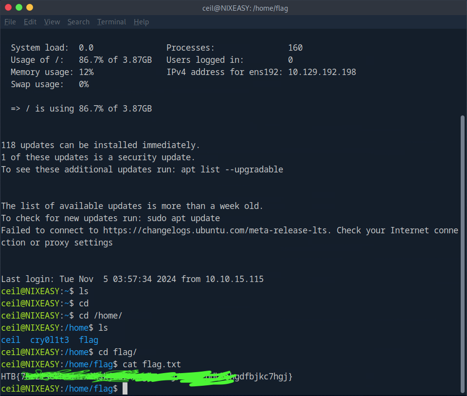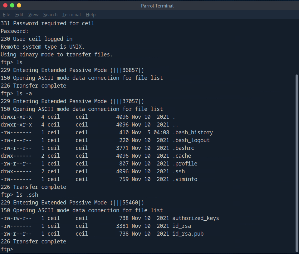 We have ssh creds, but were missing our key. Let’s see if we can connect to ftp and use our login ‘ceil:qwer1234’ to get more info