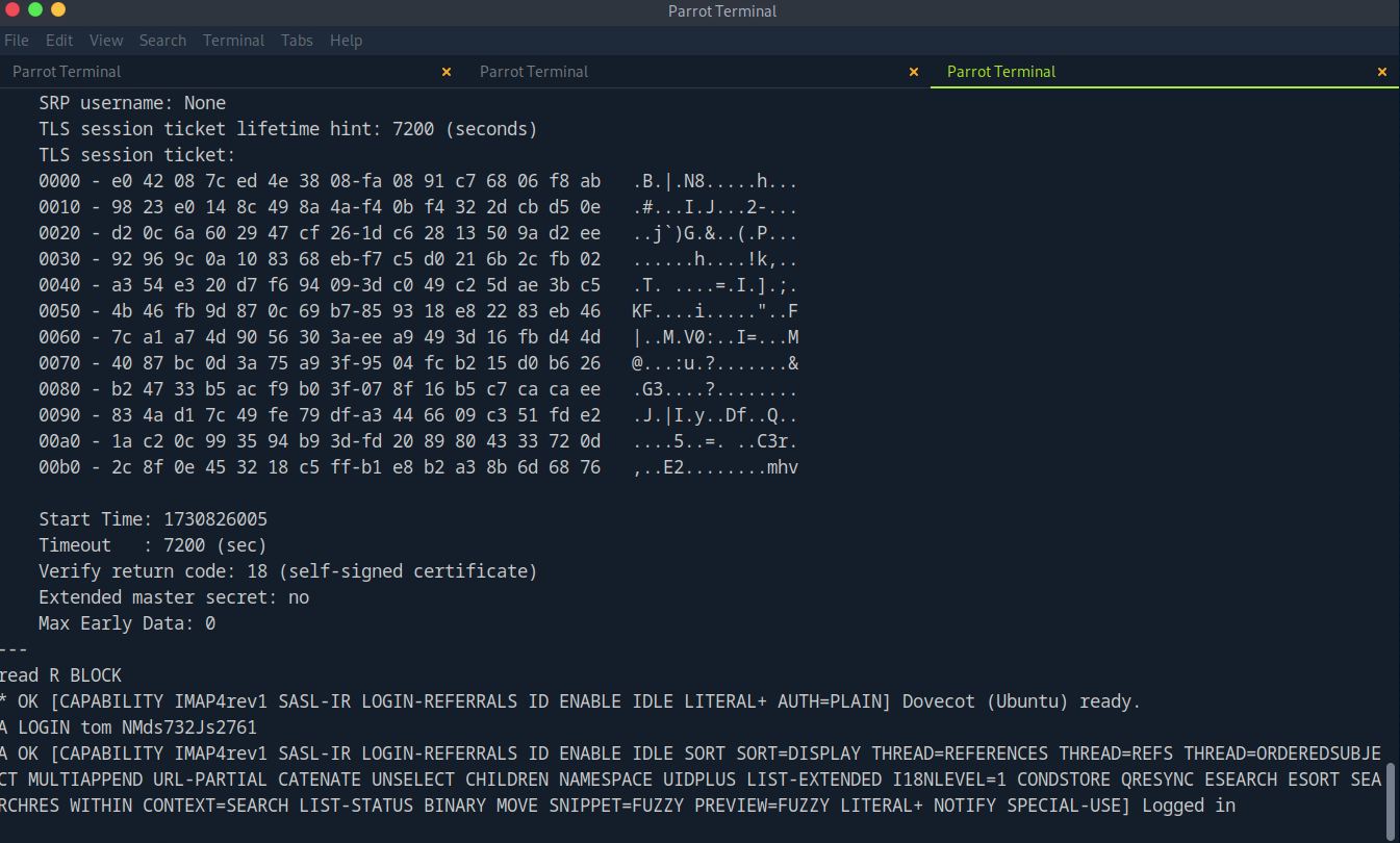Looks like Tom’s new password may have been logged and exposed here. Let’s go back to our IMAP/POP3 and try to get access.