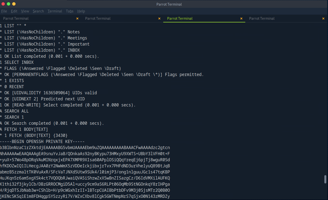 After logging in to Tom’s email and digging through the folders, we find an email containing his ssh private key! Big no-no.